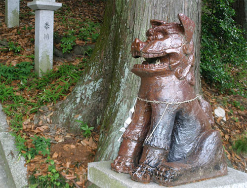 岐阜県瑞浪市にギネスにも載った世界一大きい狛犬があった。 石製が一般だが、これは高さ3.3m、巾1.5mの美濃焼である。 陶器のため、竈を作るのと焼成時間が長いので苦労したという。 国道410号を走っていたとき、偶然見付けたものだが、 瑞浪市陶町大川にある。